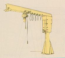 ピラー形ジブクレーンは、Iビームが旋回するジブ機構を装備した、簡単な基礎工事で建屋の内外どこにでも設置できる自立式のクレーンです。Iビームは340度旋回し、建屋のデッドゾーンにおける作業や大型クレーン下での専用作業に適しています。マストとビームの結合部及び回転部は独自の構造を採用し、スムーズな旋回と抜群の耐久性を実現しています。また遠隔・微動作業に威力を発揮する電動旋回式も用意しています。精密作業には2速形巻上機との組合せをおすすめします。