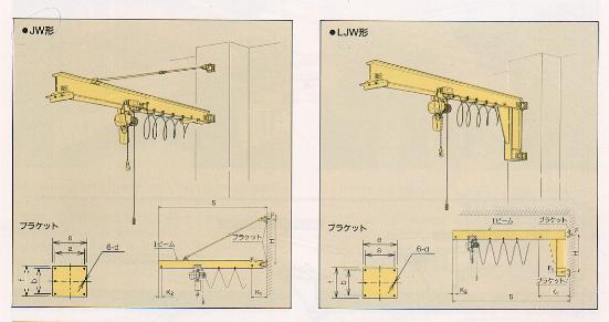ウォール形ジブクレーンは、ビームが旋回するジブ機構を装備した建屋の柱や壁に取り付ける壁固定式のクレーンで、Iビームは180度旋回します。回転支持部は上下2つのブラケットを壁に固定する方法を採用しているので、簡単に取りつけられます。また梁下空間の有効利用を実現するLJW形も用意しています。精密作業には2速形巻上機との組合せをおすすめします。