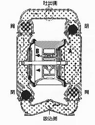 右ストローク 図1:エアーバルプが圧縮されたエアーをダイアフラムAの後部に直接導きます。圧縮エアーは、弾性材質のダイアフラムで区切られたエアーチャンバー内に直接送り込まれます。このダイアフラムが圧縮エアーと液体の仕切り膜の役目を果たし、内部にかかる荷重のバランスをとってダイアフラムヘの機械的応カを取り除いています。送り込まれた圧縮エアーは、このダイアフラムをボンプのセンタープロックから離します。その反対側に位置するダイアフラムは、加圧された時、両側のダイアフラムに接続されているシャフトによって引っぱられます。ダイアフラムBは吸込ストロークにあり、エアーチャンバー内のエアーはポンプの排出口を通って大気中に押し出されます。ダイアフラムBがポンプのセンタープロックに向かって移動すると、チャンバーB内が真空状態になります。大気の圧力で液体がインレットマニーホールドに押し込まれ、その力で吸込側のバルプボールはシートから浮き上がり外れます。液体はバルプボールの問を通って流込み、リキッドチャンバーを満たしていきます。(影のつけた部分を参照)。 |
